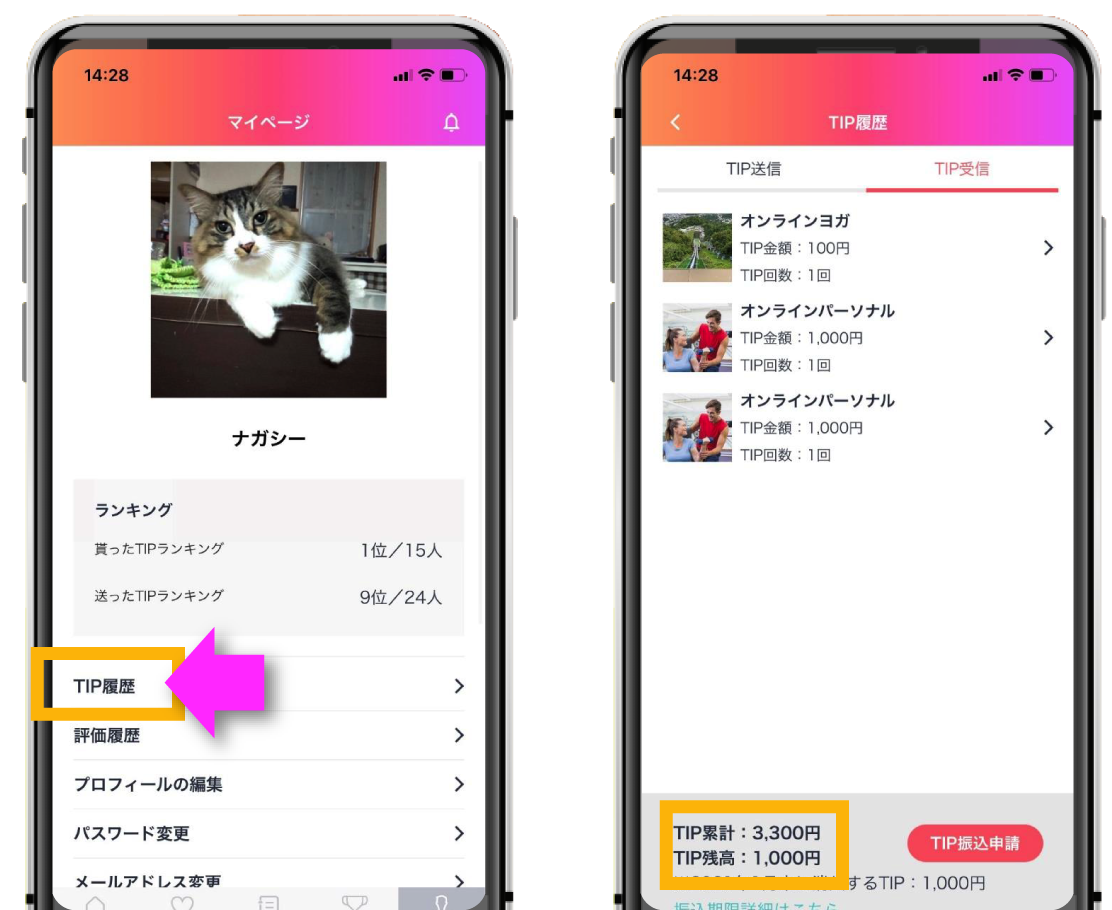 マイページの「TIP履歴」または「TIP残高」から振込申請をお願いいたします。