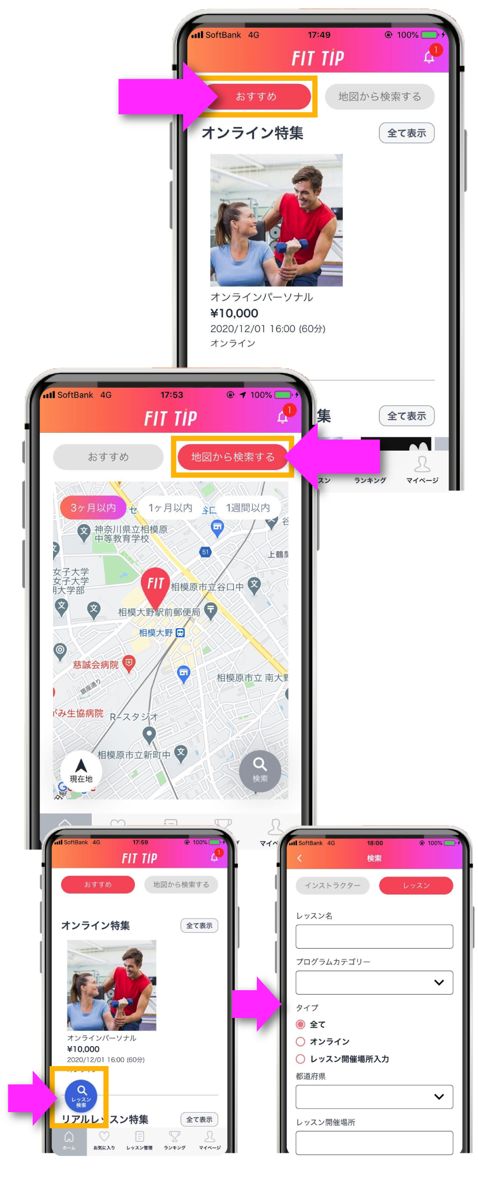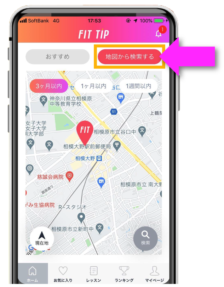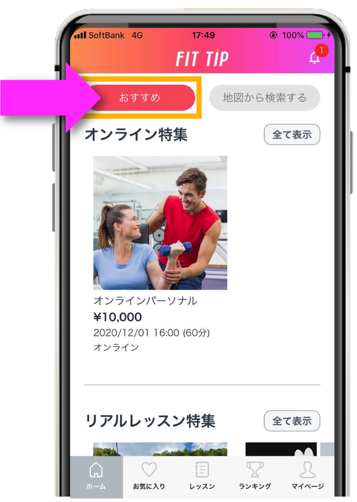 また、ホームタブにおすすめのレッスンや地図上での検索もございます。