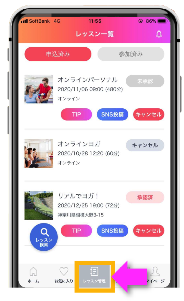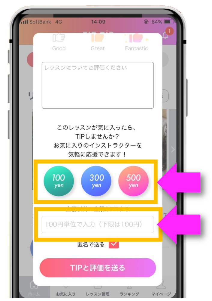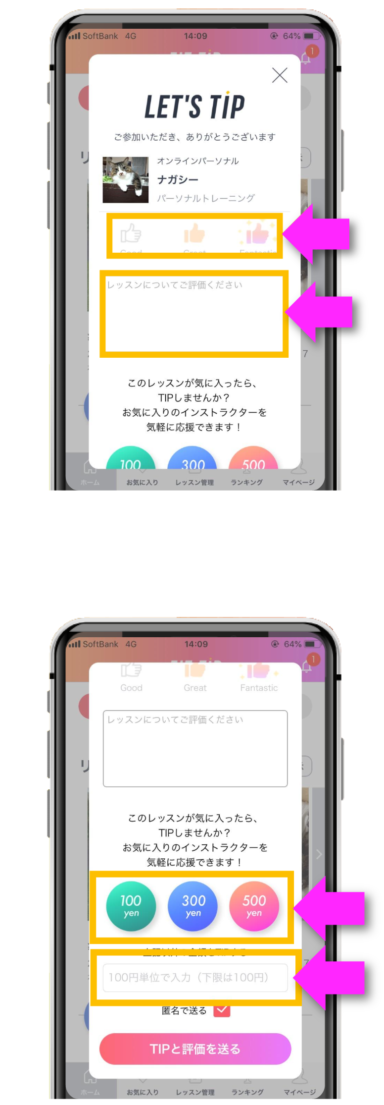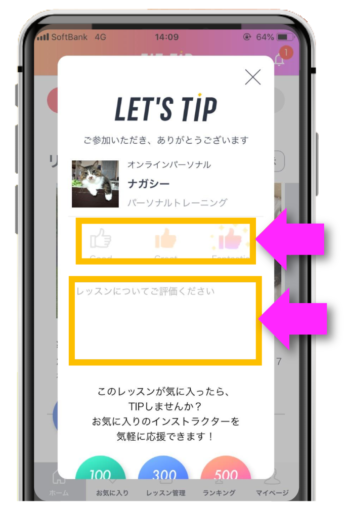 レッスン参加後やインストラクターへ【TIP】を送る機能です。大好きなあの人に感謝や応援の【TIP】を気軽に送ってみよう!