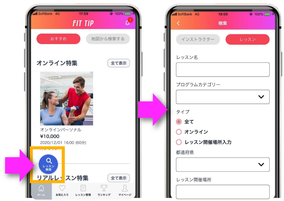 レッスンタブのレッスン検索からお好きな条件で探すことができます。